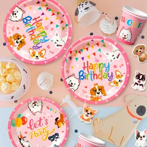 The dog themed party decorations in the dog party supplies are mainly pink in color, full of girly hearts, and will definitely be a hit at your girl dog birthday party.